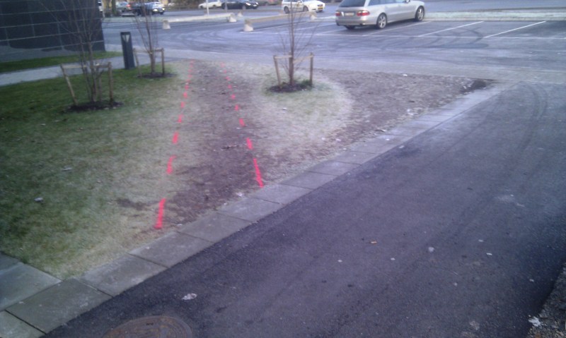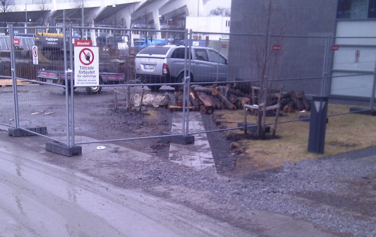 En annan sak vi i branschen kan bli bättre på är samordning. Han som sprajade den rosa linjen utefter stigen på den övre bilden hann nätt och jämt gräva ur, lägga dit lite grus och plattor innan bamsebyggarn NCC kom och satte ett byggstaket för nästa bygge och all förbifart blockeras nu i ett år eller mer 🙂