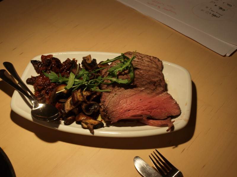 Rostbiff gjord med kärlek, lite salt och lite peppar, serverad med lätt sotiga soltorkade tomater och portabellosvamp.